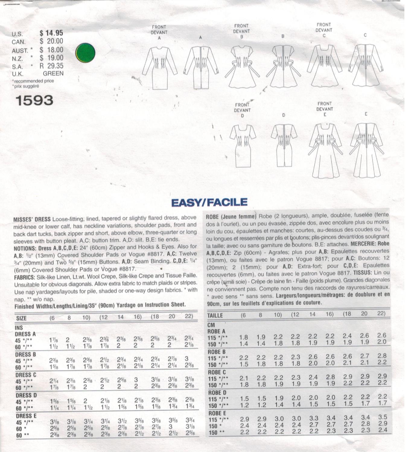 Web Vogue V1734 Sewing Pattern Misses Dress Fitted Size 16-24 New Uncut Very Easy. Web Vogue Patterns Size Chart for MISSES and MISSES PETITE Patterns.